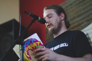Ten of the 24 contributors entertained the crowd with readings of their work. Pieces read ranged from poems such as alumni Ian Woolley’s “No Time to Explain, I am From the Future” to nonfiction works like alumni Russ Davis’ “My Open Letter to Jenny McCarthy.” The night ended with readings by Kyle Turner, a man who, according to McCarthy “doesn’t need any introduction.” Turner read his eyebrow-raising poems, “The Mystery of the Missing Lynx” and “The Fallacy of Your Existence Lies in Your Concept of God.”