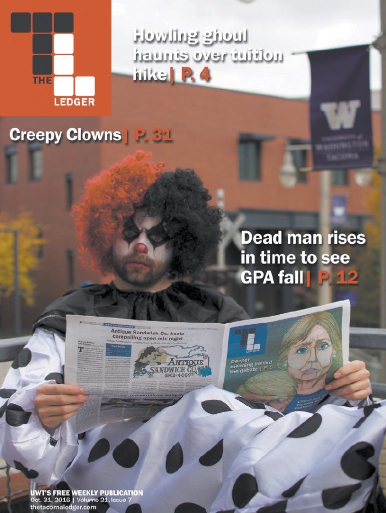 For the most part, my attire amused the students we passed, suggesting more fun than terror — providing me a lower chance of being shot. A few minutes later, my editor-in-chief propped me up on a table near Metro Coffee, slipped a copy of The Ledger in my hand, dictated my positioning, and proceeded to frame the pictures he intended to take. A young woman — presumably a fellow UW Tacoma student — approached and accosted us, asking us if our photo session was some kind of “art project.” She sternly suggested we try to “brighten up” the moment, due to clowns being a “sensitive subject” to the students she claimed were “freaked out” by my appearance. This rubbed both me and my editor-in-chief the wrong way. As soon as she got off our backs, we got the photos we needed, walked back to the Ledger office, and removed my clown getup as quickly as possible.