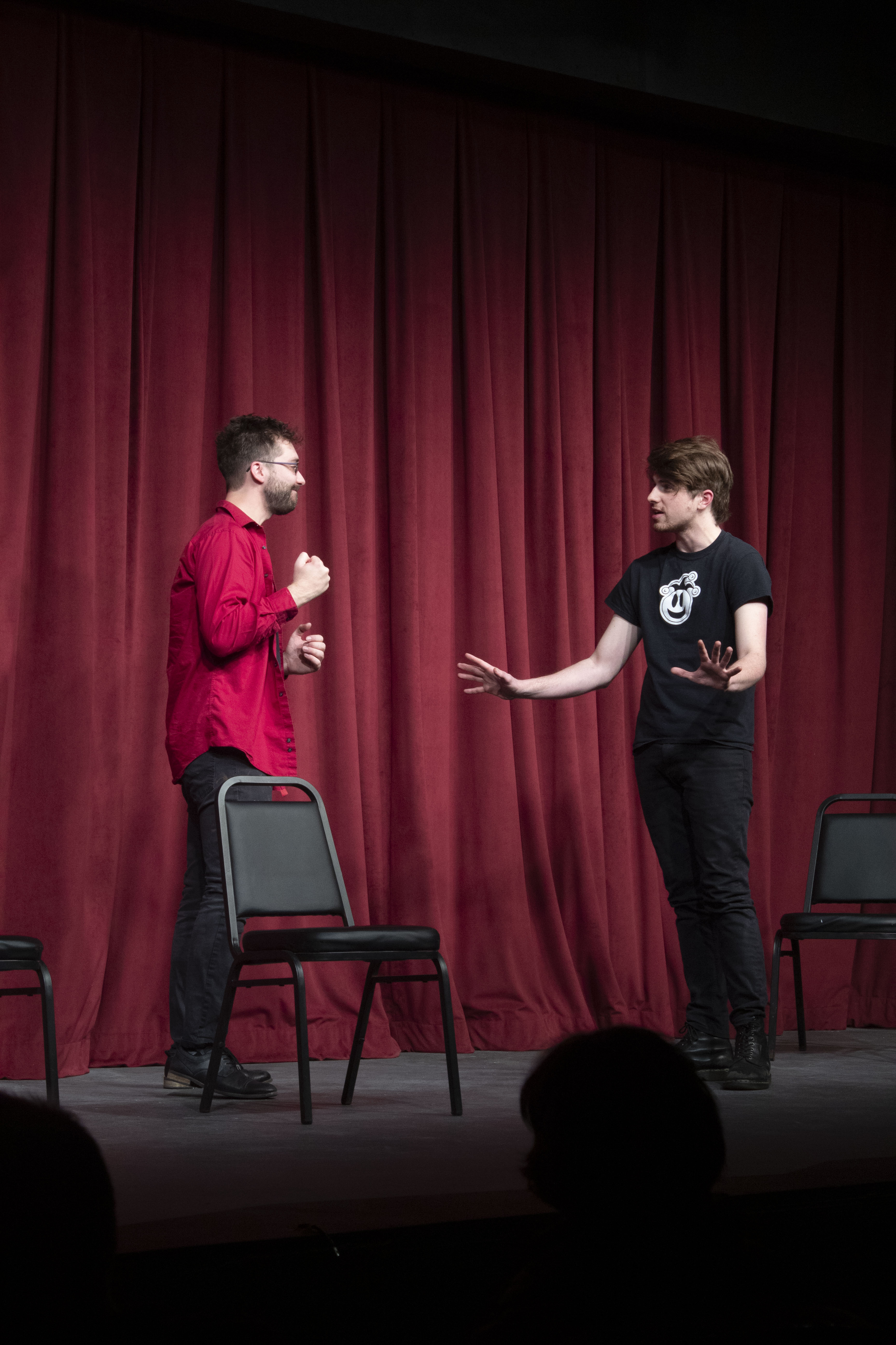 Each show runs for about an hour and a half. The first half of the evening’s performance stems from a random word provided by a lucky audience member, from which the group then creates a story and will carry it out until intermission. Once the crowd returns to their seats the other half of the show begins and a second story commences, but this time not in correlation with audience participation.