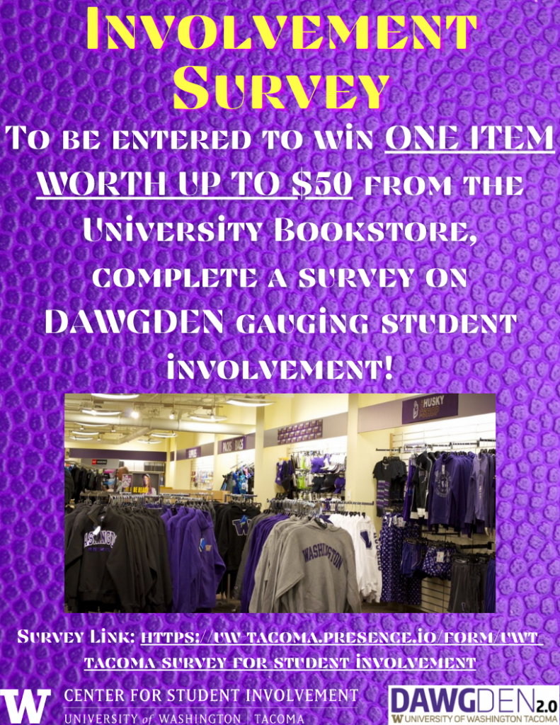 The CSL has extended the survey to remain open through winter break in the hopes that many more students will take their time to access and take the survey. If you are interested in taking this survey, you can visit https://uw-tacoma.presence.io/form/uwt-tacoma-survey-for-student-involvement to get started.