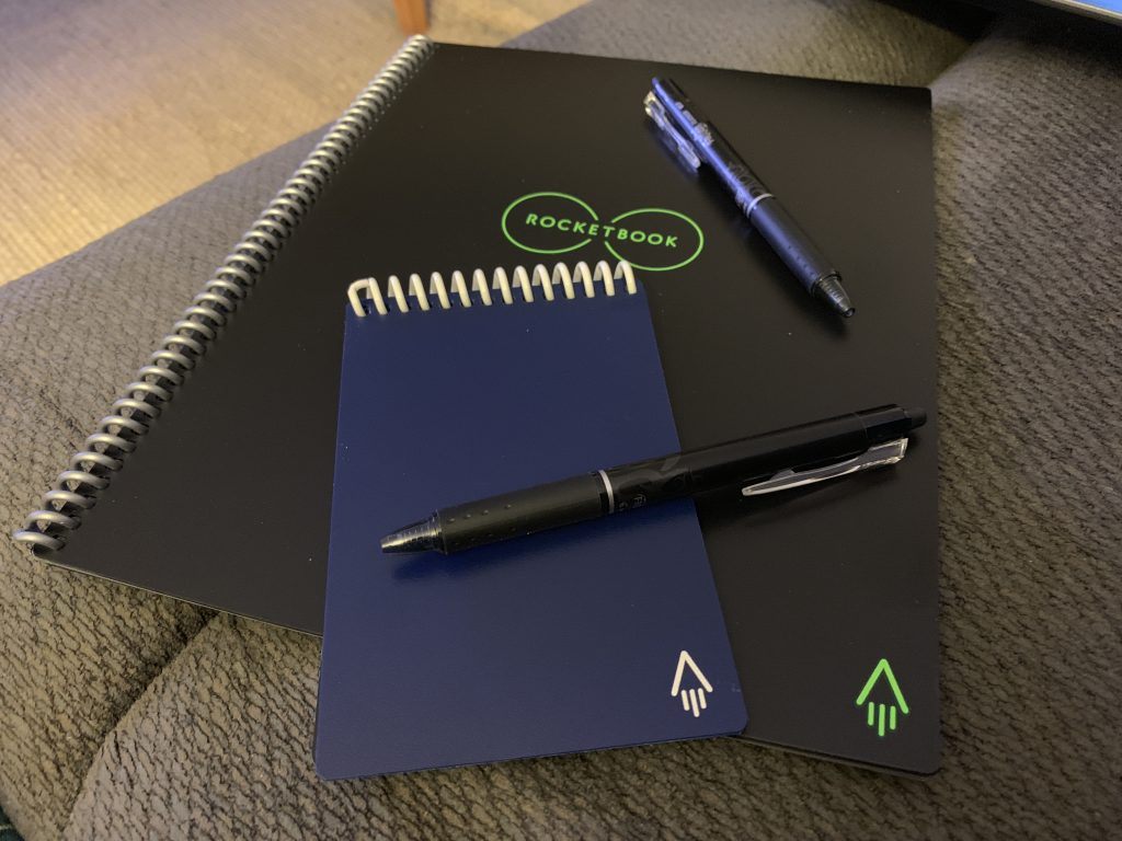 I needed something that would be light, reusable so that I didn’t have to carry four thousand notebooks around with me, and easy to save the notes from. Rocketbook turned out to be just the thing.