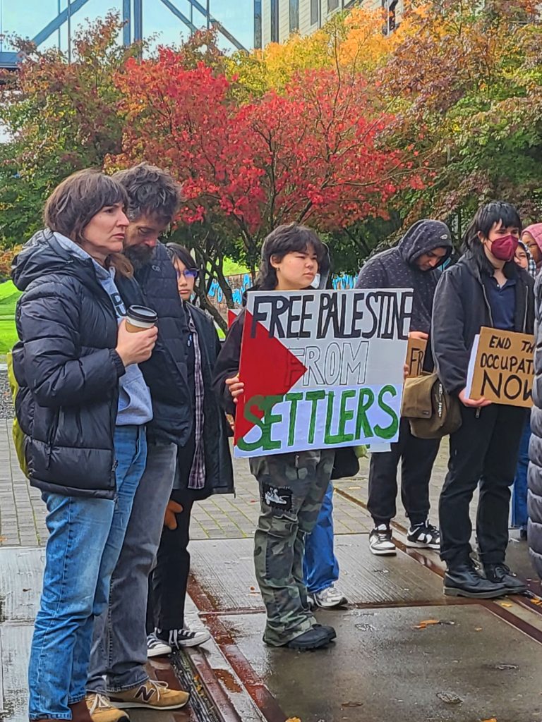 “We can get UW to divest from Boeing, but it’s not enough,” said Gordon Barnes, professor at UWT. “What will stop the bombs is worker action against Zionist terror.”