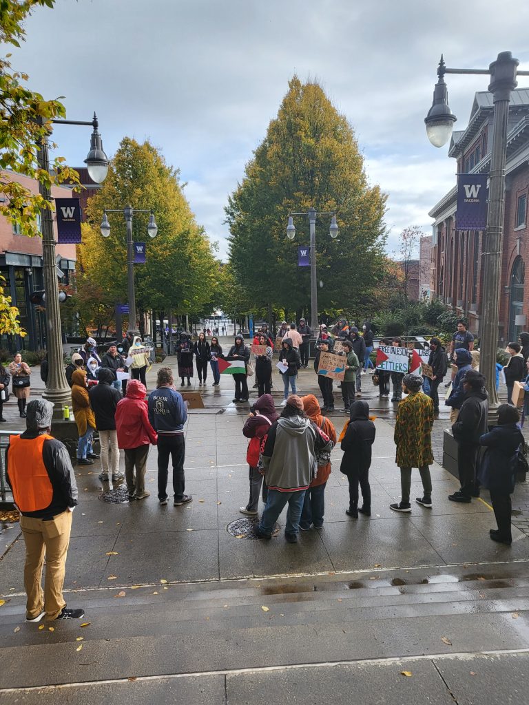 In response to the humanitarian concerns that have developed out of the Israel-Gaza War, students walked of class to show international solidarity with the Palestinians and criticize UWT’s complicity.