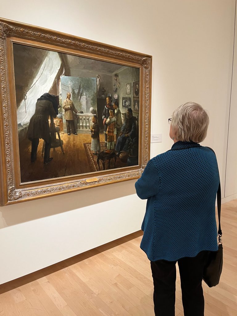 The museum also showcases several portraits of Native Americans as well. One called “Native Warrior with Breastplate” features an Indigenous person posing in a colorful garment. It’s painted with vibrant tricolors of yellow, red and green to paint his face and scarf. In comparison to many ancient breastplates, Native American breastplates were often used more symbolically. They were used as protection against arrows and spears in battle but also for their decorative or medicinal qualities. Native Americans used them for Native dances and ceremonies, which many tribes still do today.