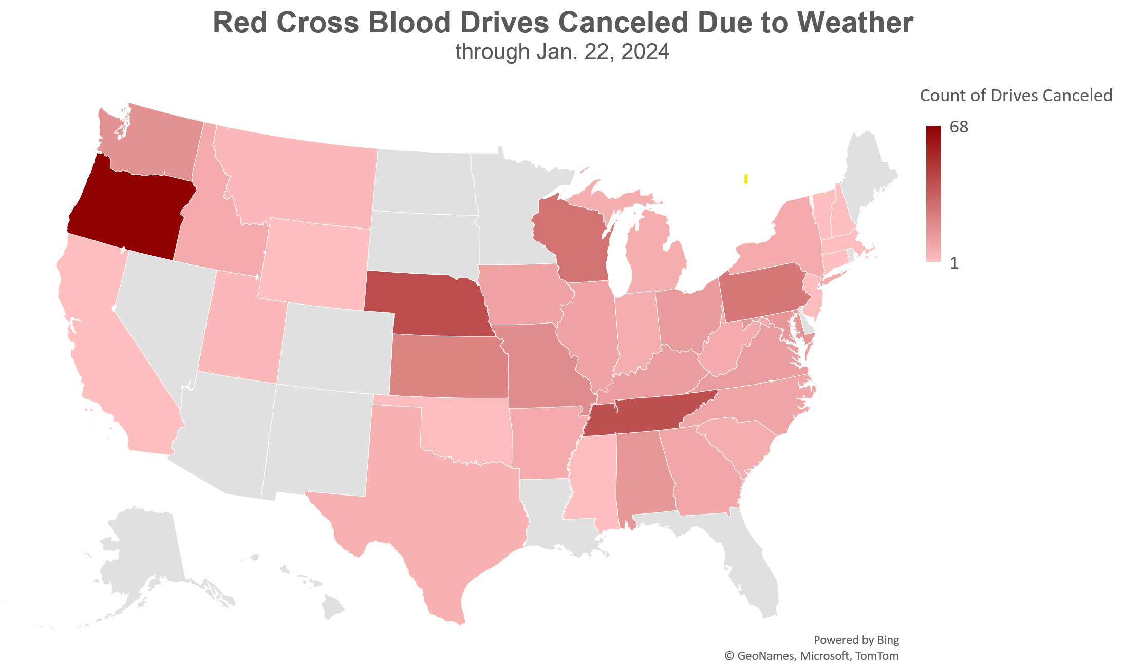 The nation is currently facing the lowest number of people giving blood in 20 years. The national blood supply remains critically low, with blood drives cancelled in nearly every state the Red Cross collects blood. As a result, almost 15,000 blood and platelet donations have gone uncollected in the month of January. Dangerous road conditions and widespread flight and shipping delays have hampered the movement of vital blood products across the Red Cross network, affecting deliveries to hospitals in some areas.