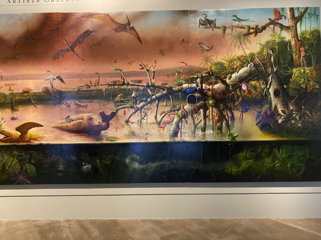 As soon as you enter the exhibit, you are greeted by Alexis Rockman’s monumental painting “Evolution.” It details the ecosystem of an Anthropocene swamp where visitors can view modern animals, prehistoric animals and hybrid creatures across the panoramic piece. The painting was later translated to glass when Rockman commissioned flameworker Vittorio Costantini to replicate the insects in the painting, resulting in over three hundred glass insects, some of which are displayed in a glass box in front of “Evolution.”