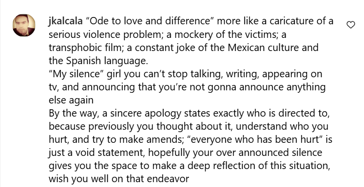 Gascón responded to the director’s comments in an Instagram post, saying that she will be silent for what is assumed to be the remainder of the film’s marketing campaign.