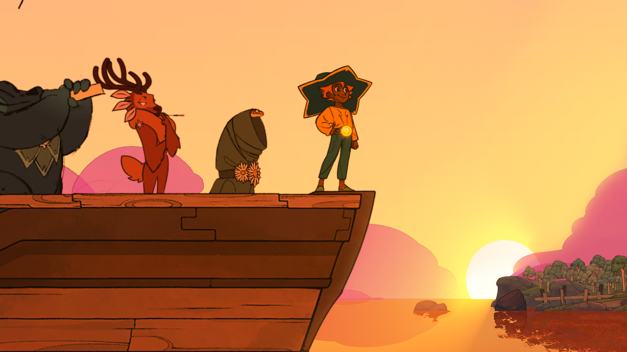 A scene of Stella overlooking the sea with the spirits. Courtesy of Thunder Lotus Games.
