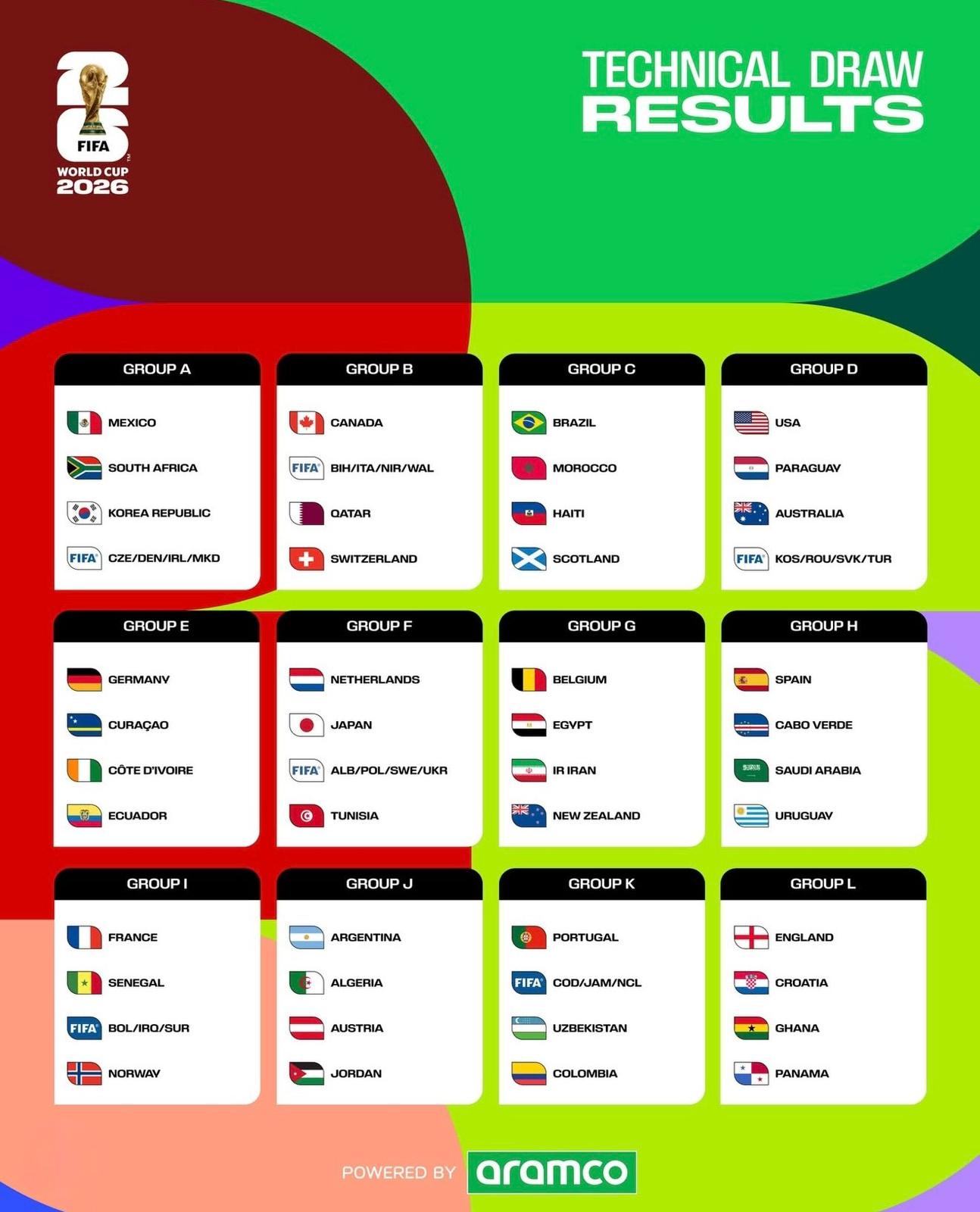 Group K: Portugal, FIFA Play-Off Tournament winner 1 (DR Congo/Jamaica/New Caledonia), Uzbekistan, Colombia