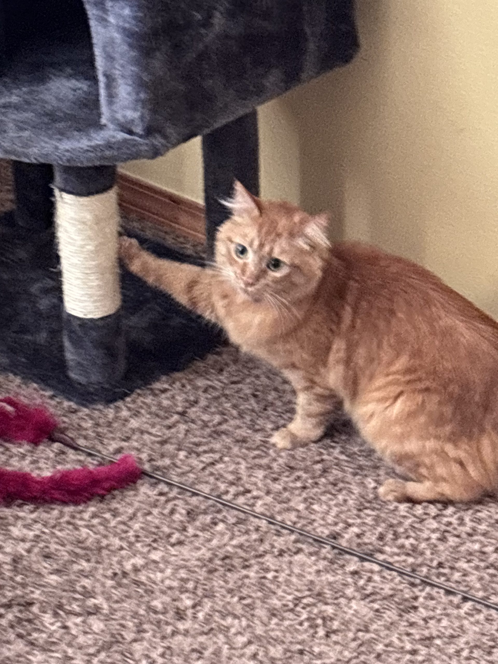 Mango contemplating whether her cat tree can fit in the Ledger office by measuring it with her paw. Photo taken by MJ Cameron