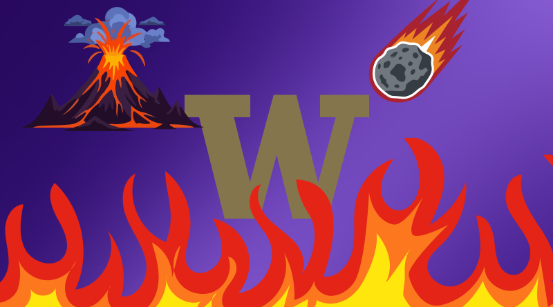 Illustration of the UW logo being consumed by flames and being hit by a meteor while a volcano erupting is seen in the background.